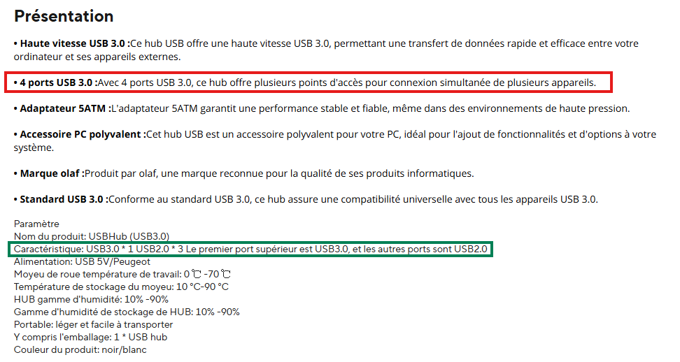 Une première phrase dans la description (mis en évidence par le premier rectangle en rouge) mentionne sans équivoque possible 4 ports USB 3.0. Cette partie est fausse. Mais un deuxième passage dans la description (mis en évidence par le premier rectangle en vert) donne quant à lui l’information exacte, à savoir un seul port en USB3.0 et les autres en USB2.0.