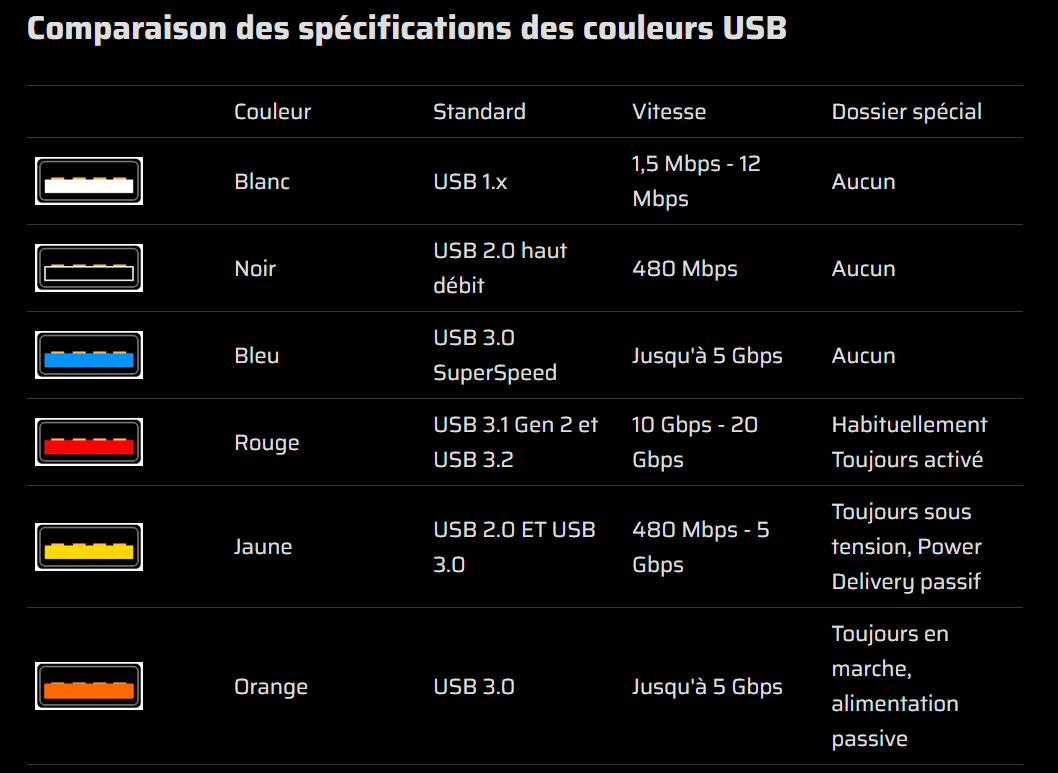 Je me suis rendu compte à cette occasion que je faisais un peu trop confiance à la couleur des ports USB. En effet, j’avais en tête “connecteur bleu = USB 3.0”. Certain sites, comme celui de Corsair, mentionnent d’ailleurs toute une palette de couleurs de ports :